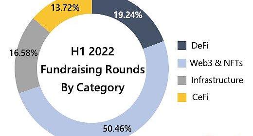 DeFi領域的融資從2021年上半年開始出現了明顯的增長。在2022年上半年,該領域總共進行了230輪融資,共籌集了24億美元。值得一提的是,雖然DeFi領域籌集到的資金最少,但融資輪次占Crypto所有融資輪次的19.24%。