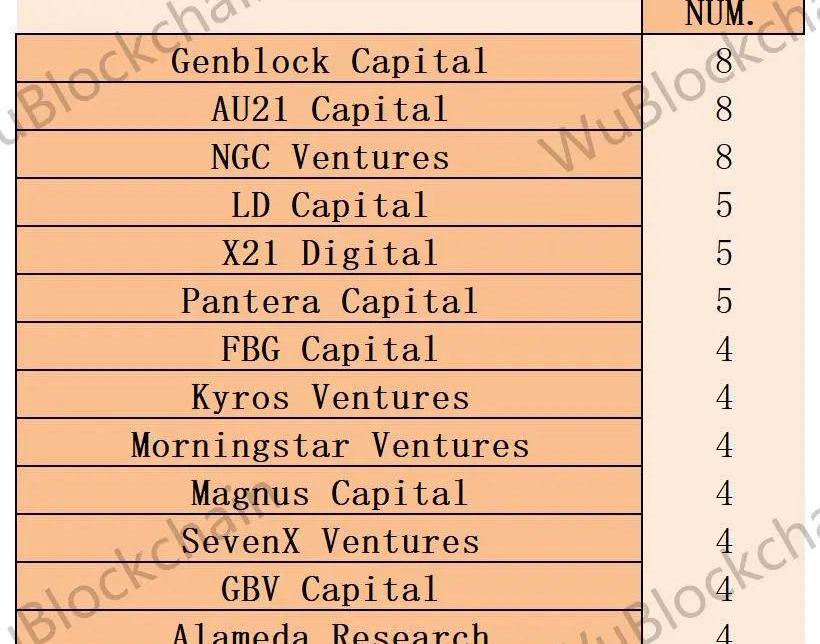 上述項目中,投資數量超過3個的VC有13家,按個數排列如下: