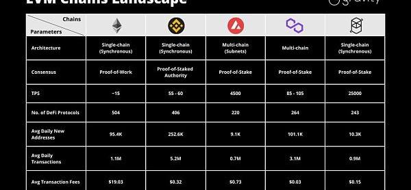 當前,圍繞著以太坊虛擬機兼容鏈發展出了一個巨大的生態系統,如Avalance,幣安智能鏈,Fantom,以及第二層解決方案,如Arbitrum和Optimism。大家可以從下圖看到基于以太坊虛擬機的智能合約平臺的比較: