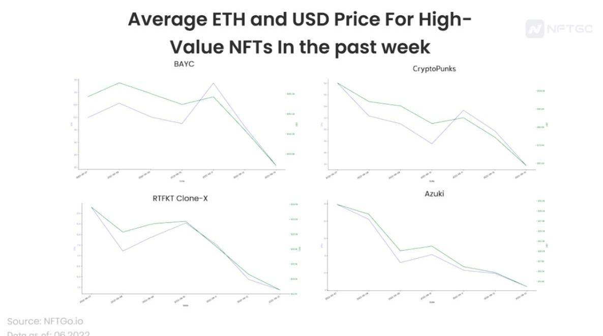 很多藍籌NFT的美元價格都隨著ETH價格同步下跌。如下表所示,以ETH和美元計價的NFT的平均賣出價都出現顯著降幅。