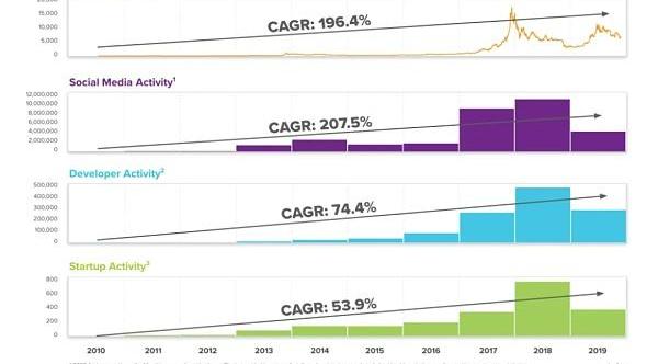 BTC價格、社交媒體活動、開發者活動以及創業活動四個指標的年均復合增長率