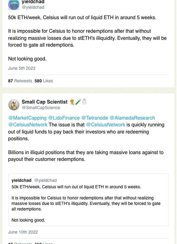 如果Celsius為了恢復用戶提款的流動性而成為stETH的強制賣家,這也許會成為觸發多重清算的導火索。事實上,對這一事件的恐懼也可能是觸發因素。