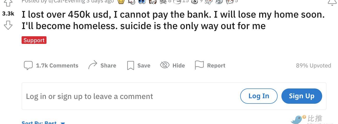 一位Reddit用戶投稿:“我損失了超過45萬美元,無法向銀行付款。我很快就會失去我的家。我會變得無家可歸。自殺是我唯一的出路”。