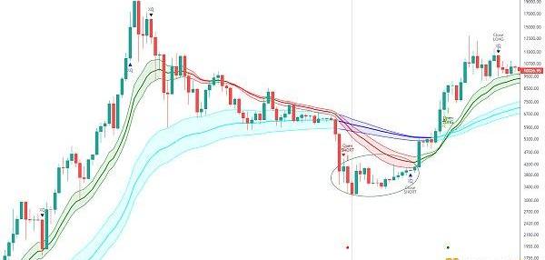 如圖所示為BTC2014年熊市底部區域,可以看到這一輪熊市大底區域位于紅色通道向下死叉藍色通道后見底,BTC在下方這一帶震蕩筑底后向上重新突破通道壓制,后面啟動牛市行情。