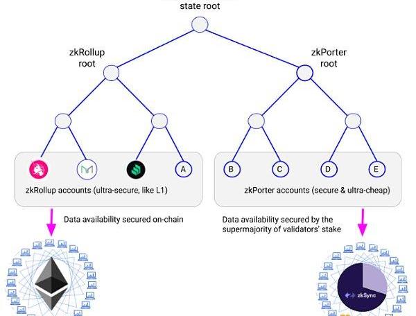 目前最流行的zkEVM項目是zkSync,它使用zk-SNARKs作為2層解決方案進行驗證和擴展。此外,zkSync選擇將數據可用性置于鏈下,并由zkSync代幣質押者使用權益證明(zkPorter)進行保護。此實現的設計基于StarkWare開發的名為Volition的解決方案。
