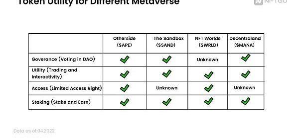 代幣是元宇宙經濟治理的關鍵因素,不同代幣設計模型將會影響用戶的交易和使用體驗。設計功能上的不同也在一定程度上說明每種元宇宙定位的不同之處。