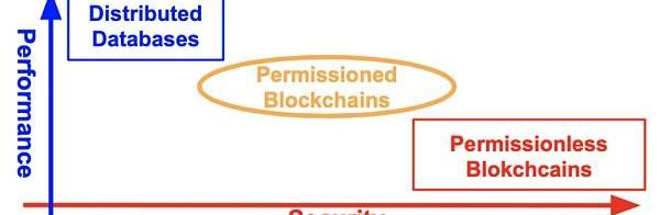 下圖顯示了分布式數據庫與許可鏈、非許可鏈在安全與性能上的權衡。