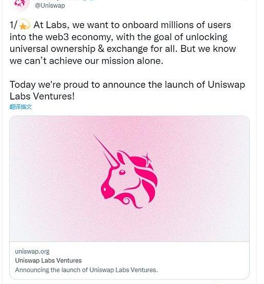 4月12日,UniswapLabs在推特指出,今天,我們很自豪地宣布推出UniswapLabsVentures。