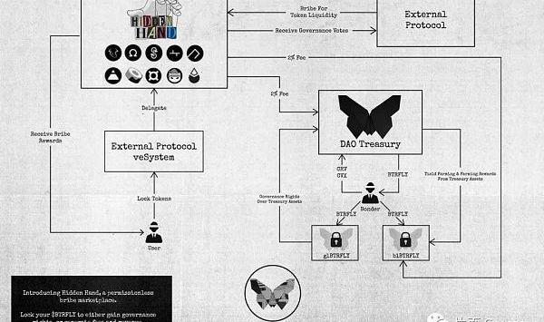 所有的投票流程,以及投票收益最大化都交給HiddenHand負責,在上述第二步中完成。同時BTRFLY的持有人通過質押BTRFLY之后,又能夠獲得指揮HiddenHand的權力。