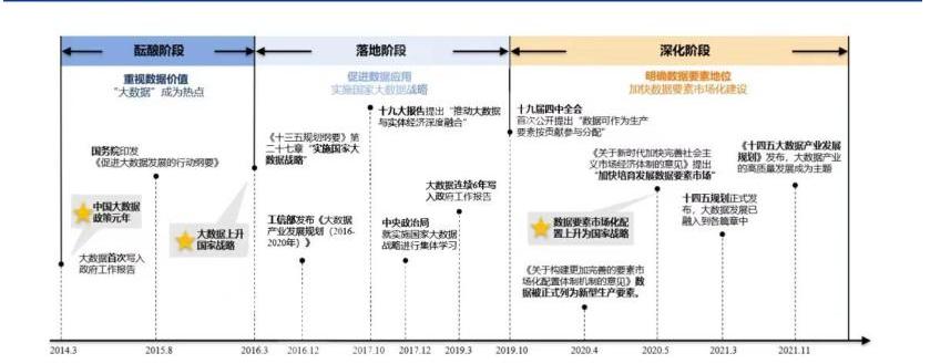 從大數據自2014年首次被寫入政府工作報告開始,我國不斷出臺了大數據相關的政策。在這期間,分別經歷三個階段:醞釀階段、落地階段和深化階段。