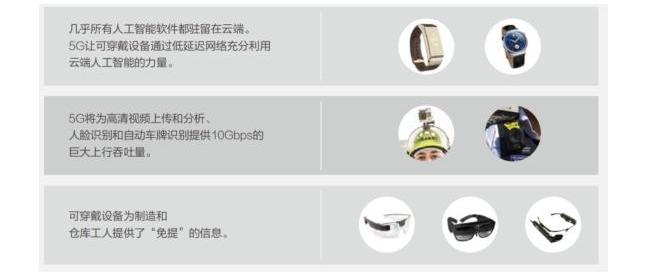 4)AI智能可穿戴設備:目前,受到網絡延遲和帶寬的限制,可穿戴設備主要通過WiFi或藍牙來連接我們的手機或終端。5G可以幫助個人和企業消費者開啟“免提”模式。同時,云AI可以通過服務器來提高處理,降低對于用戶終端設備硬件的要求。