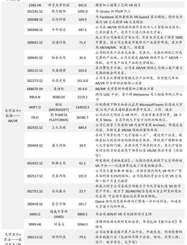 內容的展示和呈現至關重要,光學顯示是幫助用戶獲得沉浸式體驗的核心。內容呈現相關軟硬件技術的成熟,打開了通往元宇宙的大門。AR/VR:元宇宙的交互媒介,云AR/VR成趨勢。數字孿生:虛擬與現實的互相映射,元宇宙交互方案。虛擬人/NFT:虛擬人不僅能夠為元宇宙帶來豐富的內容和沉浸式的體驗,也作為一種NFT,成為元宇宙中身份認證和確權的方式。