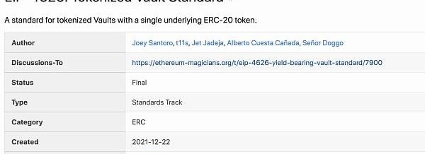 ERC-4626?的概念,最初是由Fei協議創始人JoeySantoro等5位作者于去年12月22日提出的。
