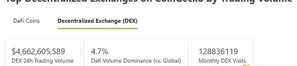 2.過去24小時去中心化交易所的交易量:46.62億美元