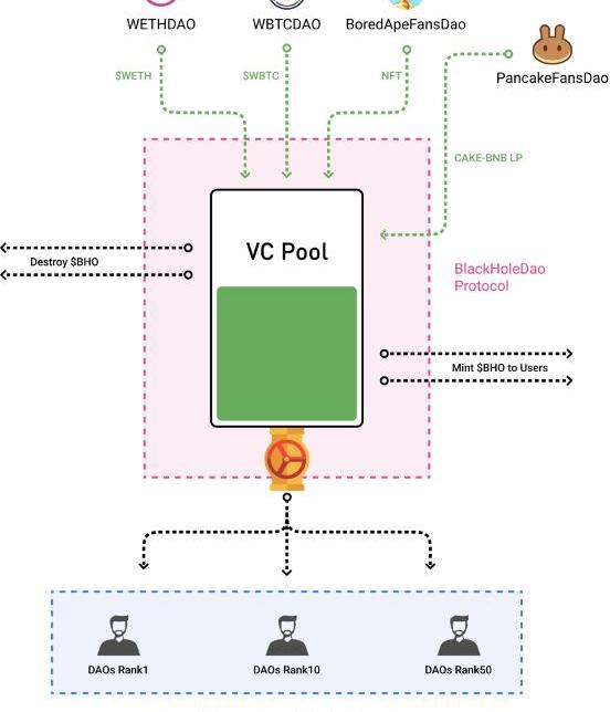 BlackHoleDAOProtocol是由國庫來支撐,其中智能合約銜接了VCPool和DonationPool,VCPool支持多個幣種來投資,其中一部分用于銷毀流動性池中的BHO,另外一部分用于DAOs投資成功之后的信用貸,而DonationPool接受投資機構、DAOs團隊即個人BUSD直接投資,最終按照2倍BUSD進行回報,反過來TransactionFeePool為DonationPool、DAOs社區、BlackHoleReactor提供了運作保障。