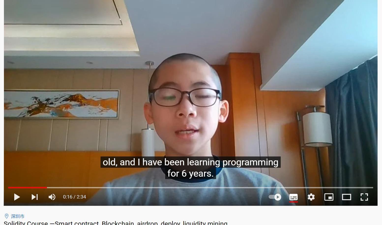 這名年幼的開發者并未止步于開發,甚至已經當上了教學者。不久前,一套智能合約教學視頻在網上流傳。而視頻作者正是當下大火的TheRandomDAO創始人——HuangZheng。他是一名年僅12歲的智能合約開發者,目前正值小學生六年級在讀,自稱學習編程已六年。