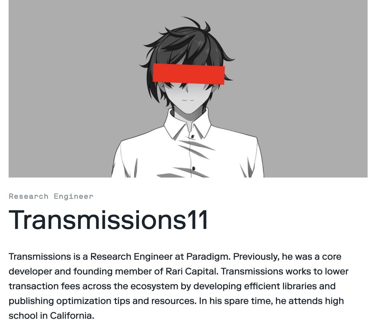 2月中旬,知名加密風投機構Paradigm公布,匿名開發者Transmissions加入Paradigm擔任研究工程師。Transmissions作為匿名開發者,網絡上關于其個人的信息并不多,但Paradigm公開的信息表示,此人將利用業余時間在加州完成高中學業。
