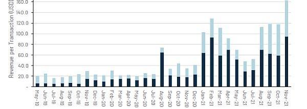 ENS每筆交易的收入也有所增加,這表明用戶注冊他們的域名的時間更長,和保護更高價值的域名,或兩者兼而有之。