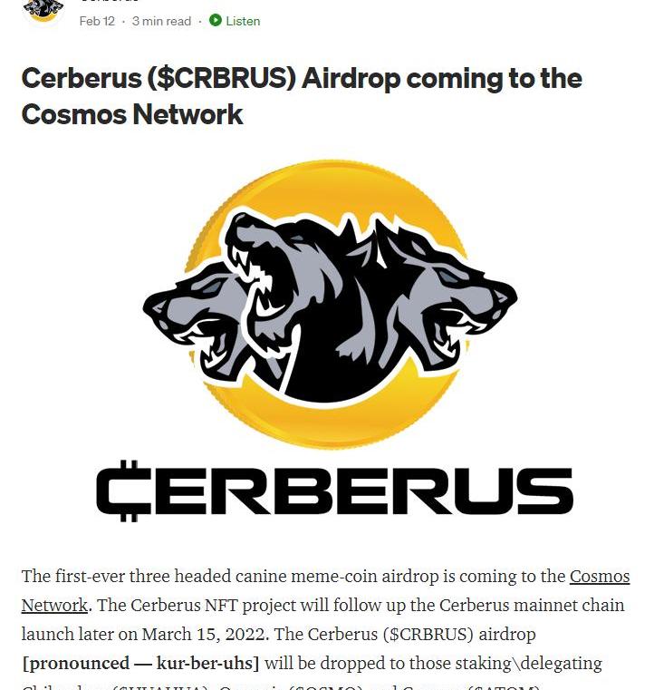 Cerberus是部署在Cosmos生態內的一個由社區主導的memecoin,允許社區對關于未來使用代幣的各種提案進行投票。