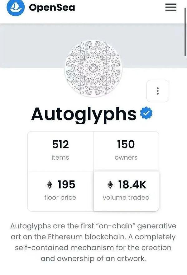 一種觀點認為與加密文化有關的作品都是加密藝術。早期以比特幣、以太坊為元素的作品不被藝術圈接受,特別是類似CryptoPunk的像素類作品更被嗤之以鼻,而這些作品或項目的背景是以區塊鏈社群文化構建起來的意義,也受到數字貨幣新貴們的青睞。也有觀點將區塊鏈視為加密藝術的基礎設施,就像中世紀發明油畫顏料一樣,認為以由區塊鏈的計算參與其中的作品才是鏈上或者加密原生的作品。在今天的加密藝術市場中也可以清晰地看到,CryptoPunk母公司LarvaLabs發布的另一個項目Autoglyphs地板價超過185ETH,遠超社交媒體熱門的頭像項目,以Artblocks平臺為代表的生成藝術作品同樣受到加密人群的青睞。