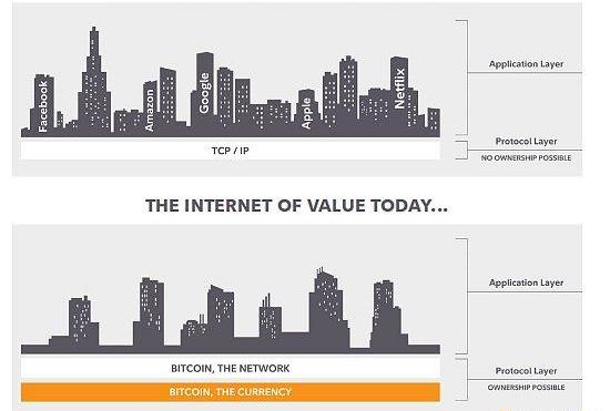 互聯網及其基礎層TCP/IP提供了一個完美的例子。被稱為TCP/IP的互聯網協議套件是一個開放源代碼的基礎層,用于通信,以及隨后構建的應用程序和內容。TCP/IP協議不屬于任何人,由于它是開源的,這個信息互聯網不允許擁有基礎層的所有權。相反,所有權只適用于構建在其上的應用程序和技術。相比之下,在數字資產世界中,基礎層的所有權是可能的。像TCP/IP一樣,應用程序也可以使用基礎層構建,然后這些技術升級增強了基礎層捕獲的價值。亞馬遜(Amazon)、Facebook、谷歌、Netflix等公司的創新,讓互聯網的基礎層變得更有價值、更重要。類似地,在特定數字資產協議中或圍繞數字資產協議進行的創新,使它們各自的基礎層所有權寬度增加,并增強了其用例和可用性。