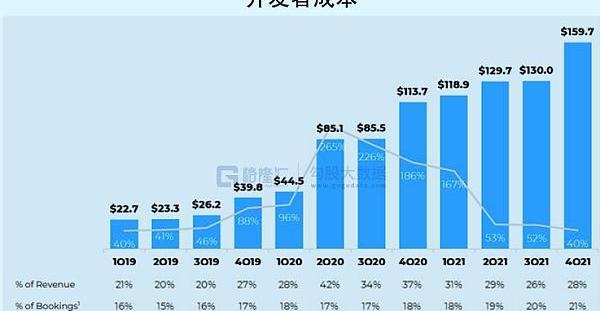 成本端上面,營收成本增長93%,近一年來首次超過營收增速。開發者和基礎設施為成本端大頭,占流水的比重基本穩定,Q4分別為21%和12%。人員成本占比也相對穩定,Q4為16%。EBITDA/Bookings21.8%,也屬于較好的水平。