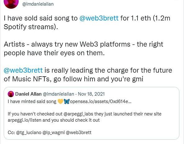 音樂NFT是NFT的一個新興用例。就像藝術NFT一樣,音樂NFT是藝術家從他們創作的作品中獲得更大份額價值的關鍵。音樂藝術家們通常只能從他們為音樂行業創造的收入中獲得約12%的收入。最近,音樂藝術家兼制作人DanielAllan將自己制作的一首音樂鑄造成了一個NFT,并在OpenSea上面以1.1ETH的價格出售了該音樂NFT,這個價格相當于在Spotify上120萬次流媒體播放量。