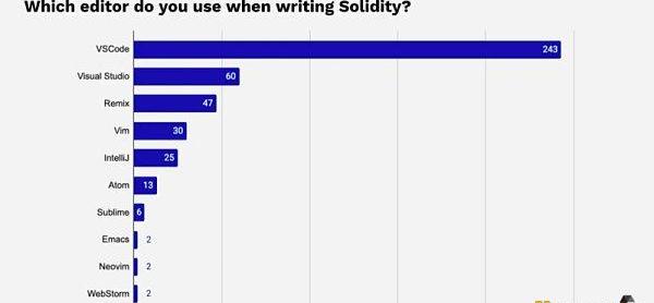 超過50%的人使用VSCode作為編輯器來編寫Solidity,其次是VisualStudio和Remix,7%的受訪者使用Vim,其次是IntelliJ和Atom。