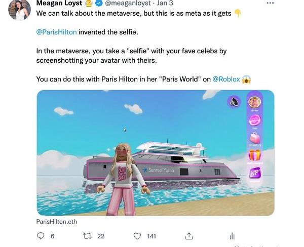 參與度、獎勵和忠誠度的交集——尤其是對于品牌和創作者:2021年,我們看到許多品牌以各種方式躍入元界。雖然有些人專注于較短的事件或體驗,但我認為許多人會更認真地考慮在元宇宙中更永久的存在——他們需要技術來幫助他們激勵他們的數字社區。也許它可以將IRL與在元宇宙中的支出與品牌相關聯并以這種方式獎勵客戶,或者根據參與度創建對某些事件的分層訪問。我認為普通的品牌/IP持有者將很難駕馭這一點,行業的即插即用解決方案將會出現。擁有大量追隨者、社區和個人品牌的創作者和名人也可以在元宇宙中取得成功——類似的概念和挑戰也適用,我很想看到更多能夠實現大規模采用的解決方案。前幾天我在Twitter上發布了關于ParisHilton在Roblox上的存在以及自拍在元宇宙中的重要性/她在其中的角色——想想她如何在元宇宙中圍繞自拍激活她的社區,并從中創造一種體驗,無論是在Roblox生態系統內部還是外部。連接世界并讓忠誠發揮作用將是巨大的。