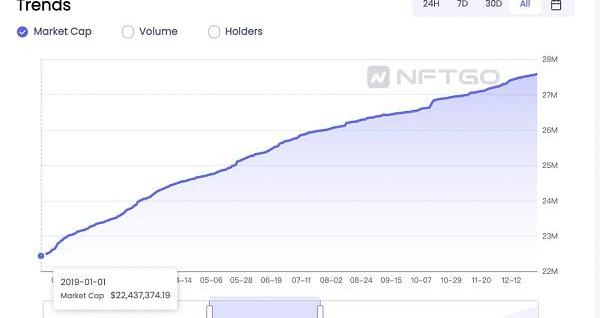 根據nftgo.io的數據顯示,2019年1月1日至2019年12月31日,NFT市值從2244萬美金增長至2759萬美金,年增長率為23%。