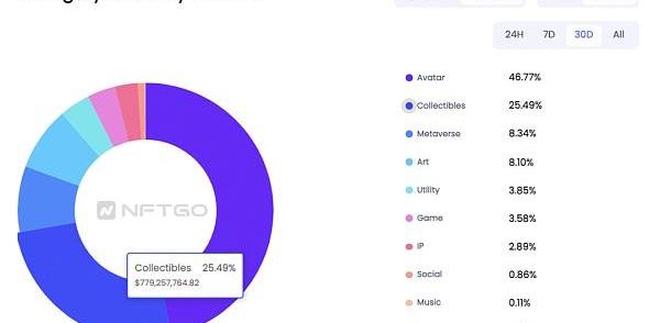 根據nftgo.io,NFT分為十個種類,分別為Avatar,Collectibles,Art,Game,Metaverse,Utility,IP,Social,Music和Defi,截止2021年12月29日,以上十個類別的占比分別為48.53%,23.76%,11.54%,6.43%,4.22%,2.5%,1.42%,1.28%,0.26%和0.05%。
