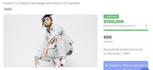 項目方合作的第一個NFT藝術家LilPump,是知名00后Rapper,在Spotify有720萬每月聽眾數。這次出售也很成功,2小時內就融到了上限50萬美元。