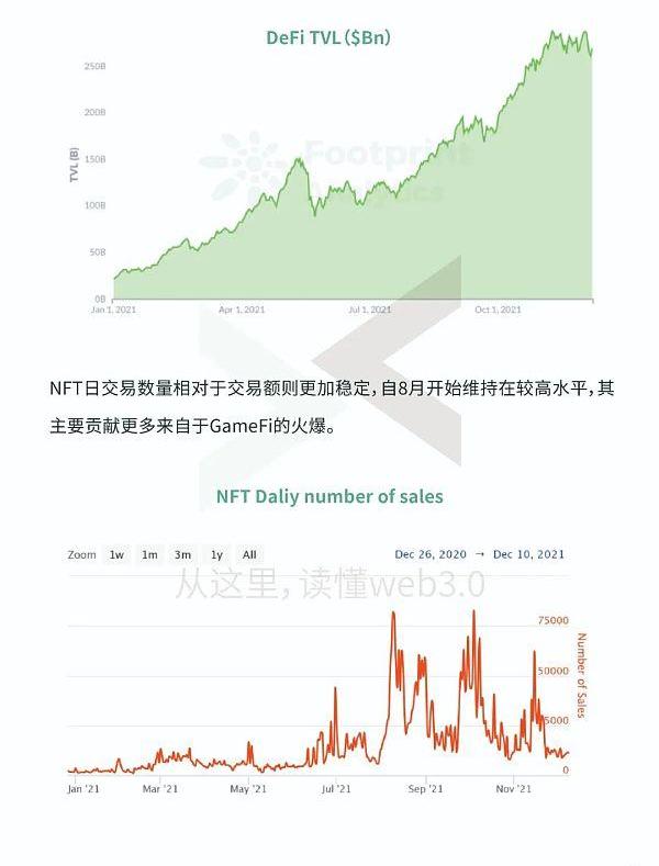 6.2021年市場數據進行橫向對比顯示,DeFi市場規模年內擴大了4倍左右,NFT年內市值漲幅達160倍,但年末市值絕對值DeFi依然是NFT市值的250倍;