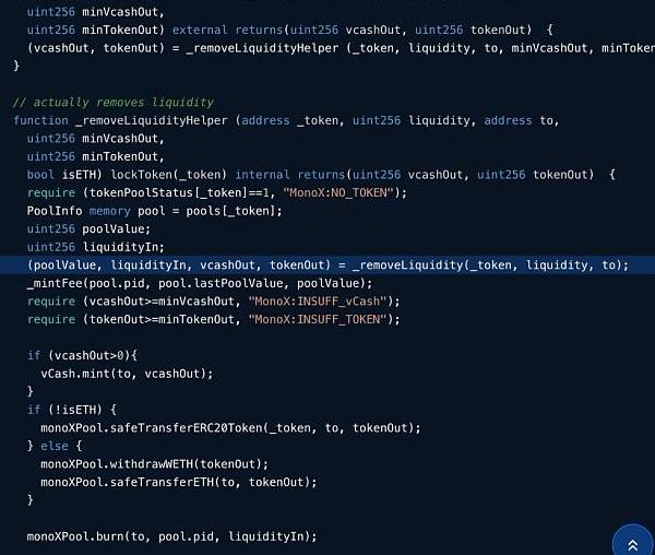 在該函數中由于tokenInPoolPrice是取的MONO代幣在池中的價格,而此價格在之前已被推高,導致tokenInPrice變大,計算最后的amountIn變小,用更少的MONO換出了原來相同數量的WETH、WBTC、MONO、USDC、USDT、DUCK、MIM、IMX等池子中的代幣。