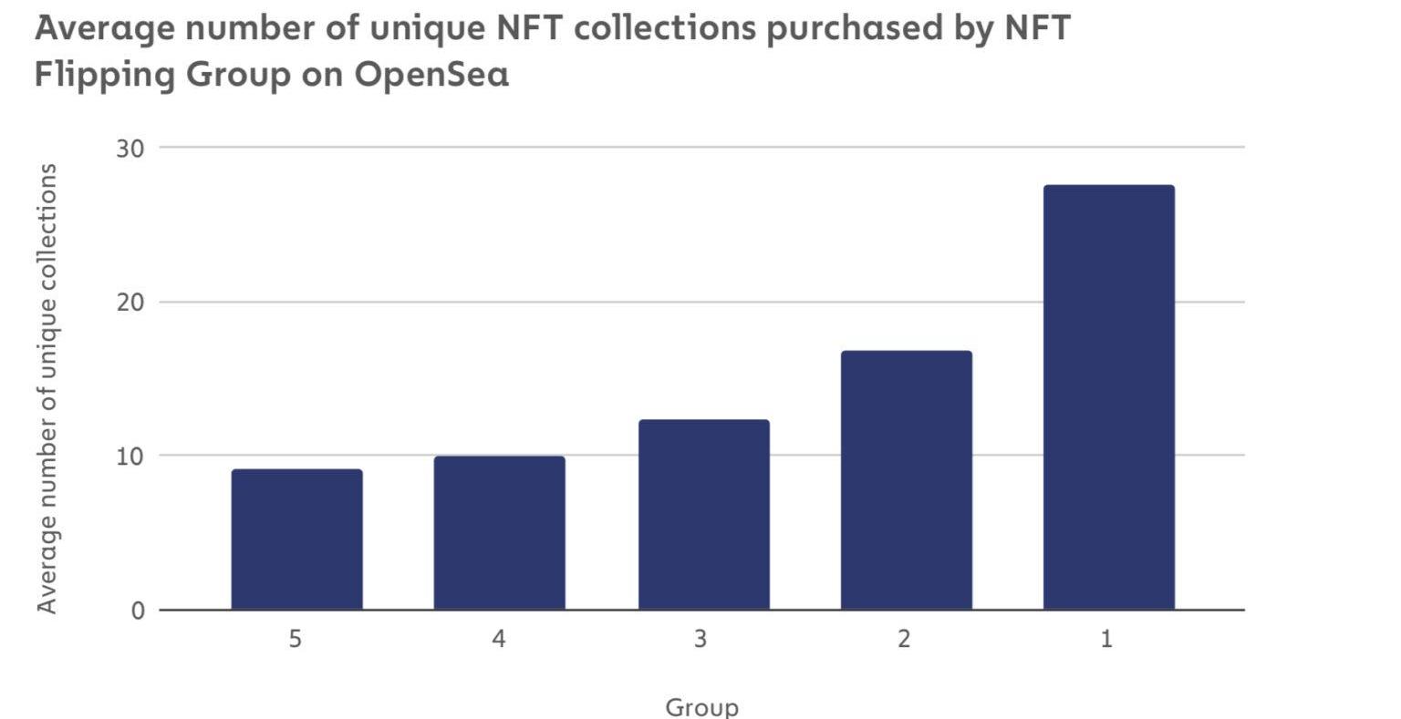 Chainalysis的調研中除了介紹NFT的二級市場發展概況,同時也將23,000多個OpenSea賬號進行分組。分組條件為每一次轉售NFT的收益率高低。以下圖表中,小組1為最成功的NFT交易組,小組5最不成功。小組2-5的投資回報倍數線性遞減的關系明顯,從1.9到0.9。而小組1則遠高于其它小組:每一次轉手NFT,小組1可以獲得平均高達2.9倍的投資回報率,比小組2高出1倍。而小組5每一次的轉售則平均回報率是0.9,也就是虧損的。我們可以戲謔地將小組5稱為「韭菜組」了。