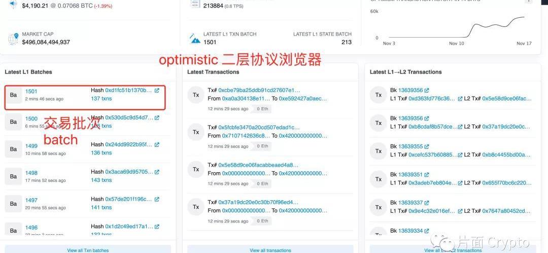 非常直接地告訴了是交易批次,不是區塊。而右邊的一層和二層的交易是要完全按照主鏈的規則記錄在主鏈,所以右邊有Bk,區塊的標識。相比于arbitrum確實用心很多。