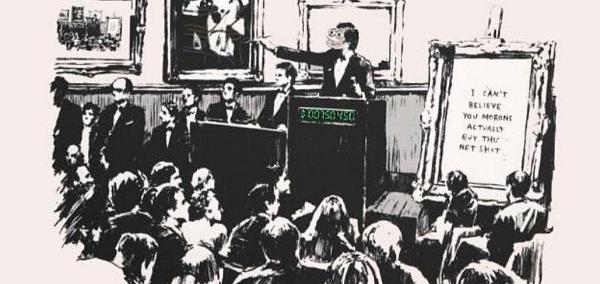 英國著名街頭藝術家班克斯為了諷刺拍賣行炒作藝術品的行為,曾專門創作過一幅名叫《白癡》的版畫。在他的這幅畫里,以為拍賣師正在口若懸河,煽動臺下的收藏家出價,而正在兜售的作品只是一個空空的相框,上面寫著:我真不敢相信你們這群白癡買下了這個東西。