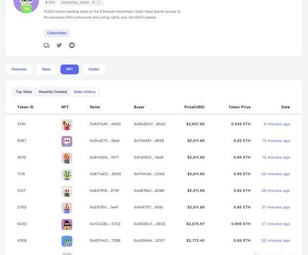 可以觀察到,Doodles和HeadDAO的交易記錄都是比較頻繁的,是最近熱度和流動性極高的新項目,7天內的流動性分別為30%和54%,近7天的市值增長也是十分的迅速,進而可以結合項目詳細數據,以及參考往期文章的分析方法做進一步判斷。
