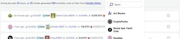 此外,可以對巨鯨實時交易的時間、交易行為、NFT系列及編號、交易對方地址、價格及gas信息。同時支持對項目名稱、交易行為、時間的維度進行篩選。