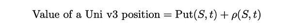 為了讓事情變得簡單一點,我們首先將Univ3LP的價值分解為兩個不同的部分V(S,t)=V_p(S,t)+Vρ(S,t),其中V_p=-max(KS,0)是看跌期權的收益,范圍收益Vρ是由以下式給出的: