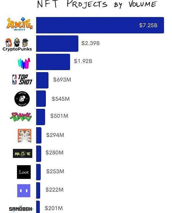 總的來說,情況并非如此,有一個巨大的例外:AxieInfinity,它既是一款區塊鏈游戲,也是NFT項目中數量最多的。然而,從整體上看,pfps似乎是占主導地位的形式。按歷史數量排名前十的項目中有五個可以合理地歸類為pfp產品。按數量計算,它們達到54億美元,占總數的37.3%。如果Axie被排除在外并替換為第11個項目——Sandbox——pfp在這些項目中的交易量份額將達到73%。??