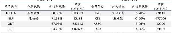 上周行情回顧:ChainextCSI100上漲7.5%,細分板塊中基礎增強表現最優。從細分板塊來看,物聯網&溯源、文娛社交、商業金融、基礎增強、基礎鏈、存儲&計算、AI表現優于ChainextCSI100平均水平,為24.56%、16.21%、13.78%、36.88%、18.93%、14.66%、16.33%;交易支付、純幣類遜于ChainextCSI100平均水平,為5.37%、6.77%。