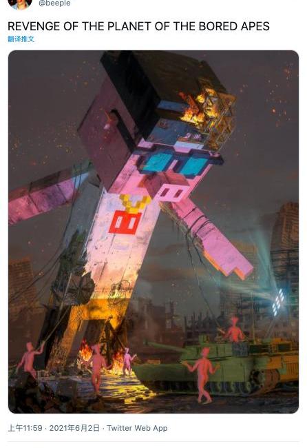 而24小時后,Beeple發布了下一幅作品,引起了更大的討論。畫面中描繪了幾只猿猴一起打敗了一只Meebits的畫面,在這條推特的評論區,一眾猿猴的持有者紛紛發問:「這幅作品我可以在那里購買?」