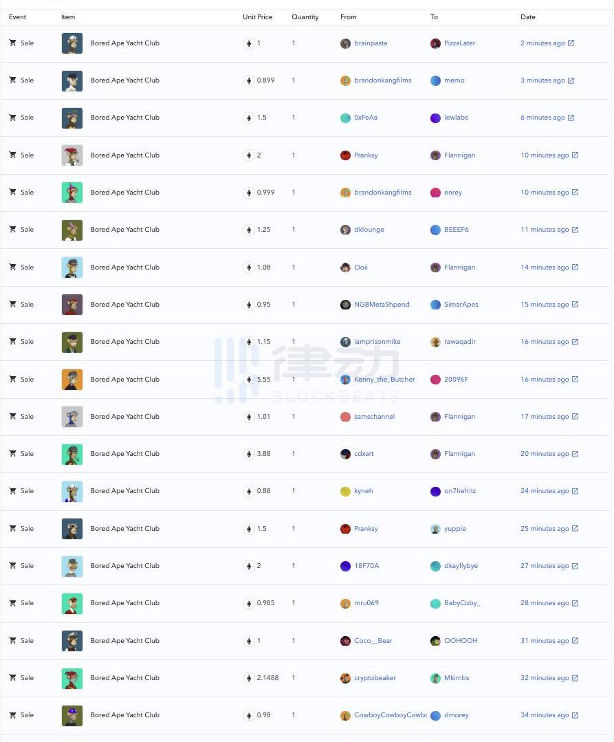 而再當你看到BoredApeYachtClub的歷史記錄時便會發現,這個項目的流動性遠遠超乎你的想象,幾乎每隔幾分鐘就有一只猿猴轉手。