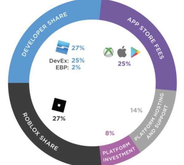 據該公司稱,通過Roblox花費的每一美元中,27%歸開發者,25%歸應用商店,12%用于投資和支持平臺,27%歸Roblox本身。