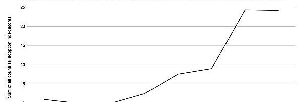 去年,中國在全球采用指數中排名第四,而美國排名第六。今年,美國排名第八,中國排名第十三。兩國下降的最大原因是它們在以互聯網使用人口加權的P2P交易量中的排名急劇下降——中國從這方面的第53位下降到第155位,而美國從第16位下降到第109位。?