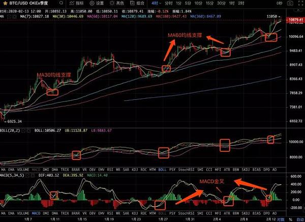 一般來說,無論是突發行情還是大周期的上漲(下跌)行情,中間總會回撤確認支撐(壓力),此時是不錯的進場點位。如下圖BTC的4小時K線,在MA30/60/90均線支撐和再次突破時,MACD金叉及Boll從下軌突破中軌、或是喇叭口由收窄突然放大時,均是不錯的買點。這些買點是由大盤上漲后回調產生的機會。