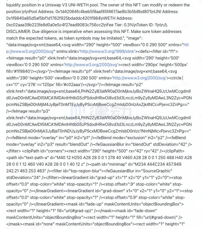 UniswapNFT元數據的存儲方式極為獨特,值得重點解讀一下。我們還是先通過Etherscan查詢一下鏈上數據,得到的返回結果如下: