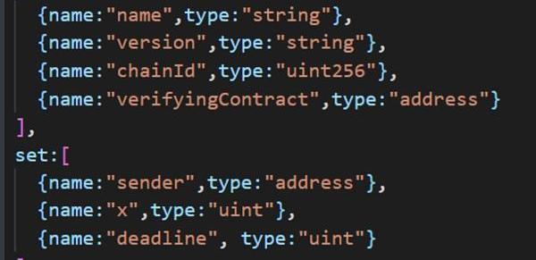 數據是EIP-712中最關鍵的部分。這些要簽名的數據必須符合預定義的格式。它必須有一個EIP712Domain和要簽名的數據(在我們的示例中設置)。兩者的組合將被簽名并發送給智能合約進行驗證。