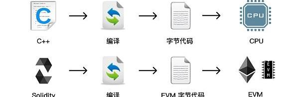 EVM就是以太坊的CPU,以太坊開發者們通過編程語言Solidity寫好的程序,被編譯為EVM可以理解的EVM字節代碼,EVM就可以運行智能合約的程序。